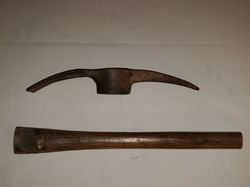 This e-tool commonly equipped to soldiers was named after "pick mattock" a tool that like this one combined the functions of a pickaxe and an adze. Its construction allowed it to be broken down into two parts, the blade and the handle, so it could be carried with ease.
